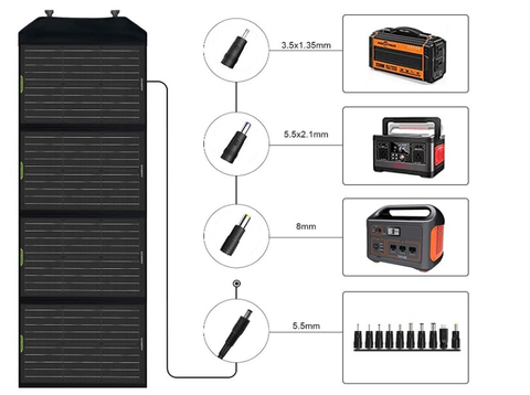 Nuestro panel portátil de nueva versión viene con conectores de CC, que se ajustan a la entrada de CC de 12 V de la central eléctrica del mercado. Pero para algunas centrales eléctricas de marca construidas con diferentes puertos de entrada de CC, deberá obtener un cable de extensión con un adaptador adecuado.
