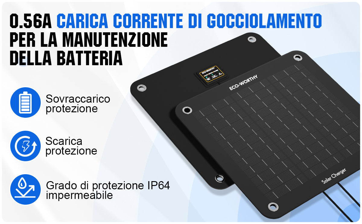 ECO-WORTHY 5W & 10W Cargador solar portátil por goteo cargador/mantenedor de goteo perfecto para baterías de 12V de automóviles, motocicletas, barcos, motos de nieve, tractores, etc. Viene con el adaptador para encendedor de cigarrillos, 1 par de pinzas para batería y 4 ventosas de PVC. Clips de diseño único de alta calidad para evitar cortocircuitos. Carga de batería de 12V en emergencia, adecuada para vehículos en trabajo al aire libre, viajes o entrenamiento de campamento, y los vehículos se colocan durante mucho tiempo. Fácil de instalar y completamente libre de mantenimiento. Protección del medio ambiente y ahorro de energía, diodo de bloqueo incorporado para evitar la descarga inversa, no solo mantiene la vida útil de la batería sino que también extiende su vida útil, evita que la batería se agote. Tenga en cuenta que se supone que la película protectora de plástico en la superficie del panel se despegará. La opción de enchufe de cigarrillo solo funciona si tiene energía constante cuando la llave está fuera del encendido. Cuando encienda el automóvil, retire el panel solar de la batería del automóvil.