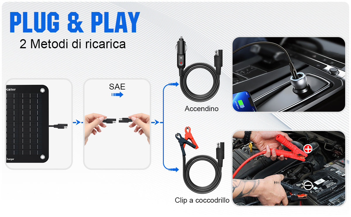 ·Conector SAE Plug & Play: El conector SAE del panel solar es plug and play, no es necesario reconocer positivo o negativo, simple y fácil de usar. Nota: Como se trata de un panel solar de 5W y 10W, la función principal es evitar que la batería se agote, no para cargarla por completo.