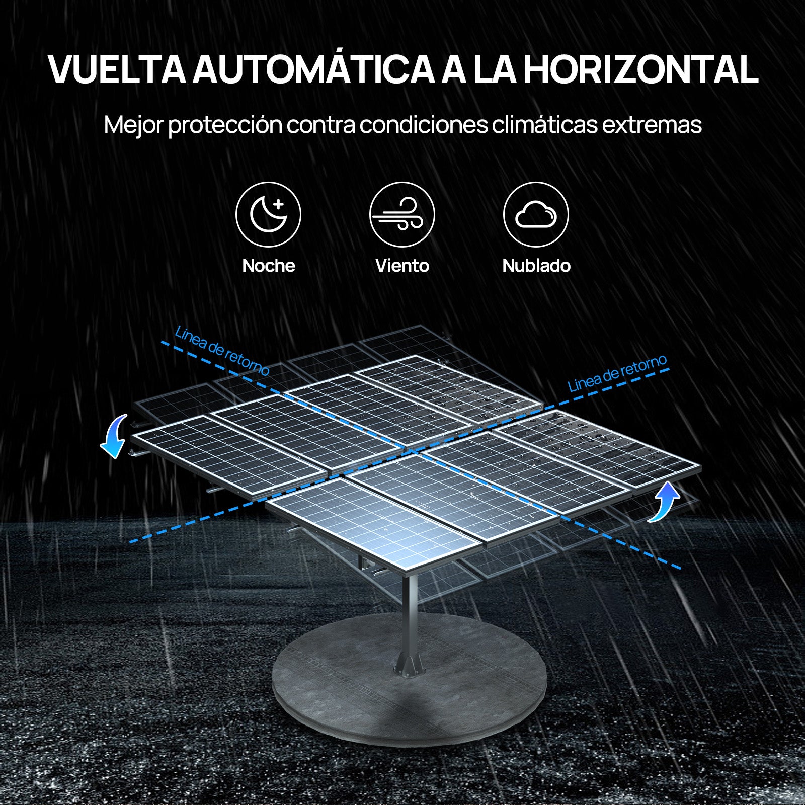 Seguimiento automático de doble eje : Oriente sus paneles horizontal y verticalmente para capturar la máxima luz solar.Mayor rendimiento (+40 %) : Disfrute de una producción de electricidad significativamente mayor, ideal para maximizar su retorno de la inversión.