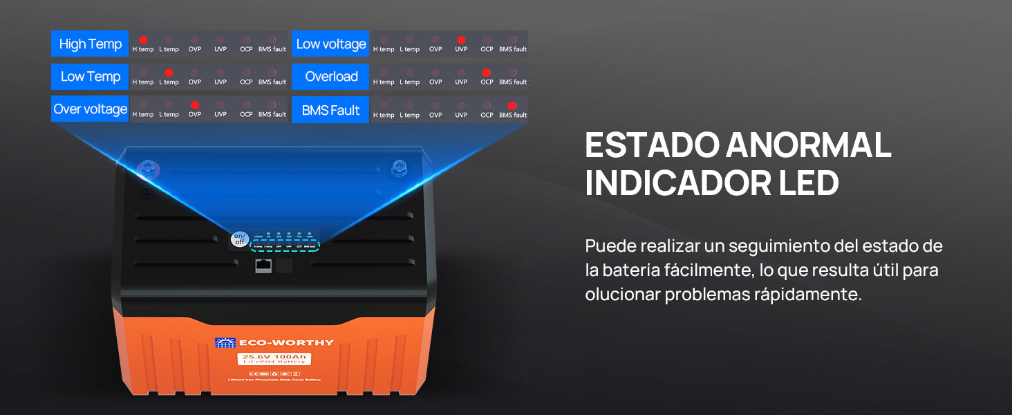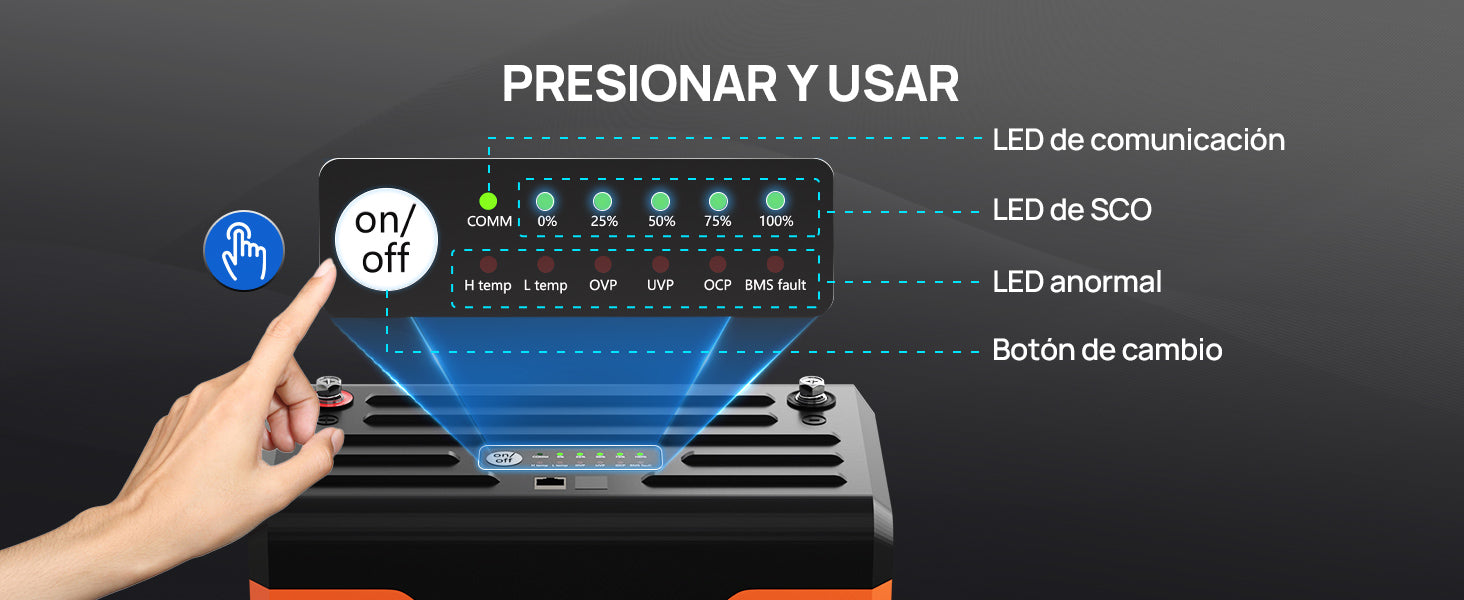 ·[Panel indicador de estado de la batería y estado de carga]: el indicador de estado de carga muestra el nivel de carga de la batería por etapas, mientras que el LED de estado detecta rápidamente los errores. Así siempre tendrás a la vista el estado de la batería. El panel LED se puede encender y apagar con solo pulsar un botón.