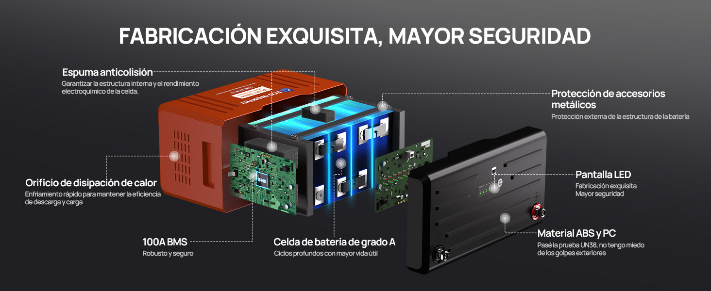 ·[Protección múltiple BMS]: además de la protección contra sobrecalentamiento, sobretensión y sobrecarga, el BMS también ofrece protección contra heladas. A temperaturas de -12 °C a -2 °C, interrumpe la carga y la reanuda automáticamente a 0 °C para proteger la batería en climas fríos.