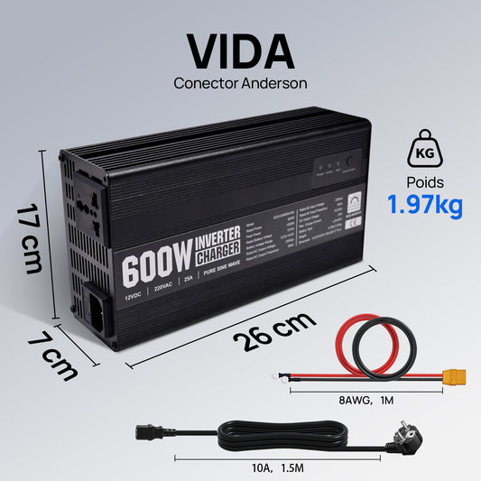 Cargador de batería LiFePO4 de 14,6V y 25A con inversor de 600 W de 12V a 230V para batería