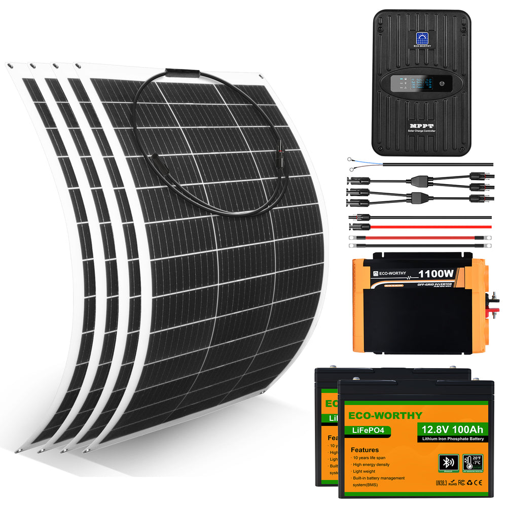 Este kit completo incluye Panel solar flexible 130W 12V alto rendimiento, Regulador solar 30A/60A, Inversor de onda sinusoidal pura, Batería Litio y todos los elementos fotovoltaicos necesarios.