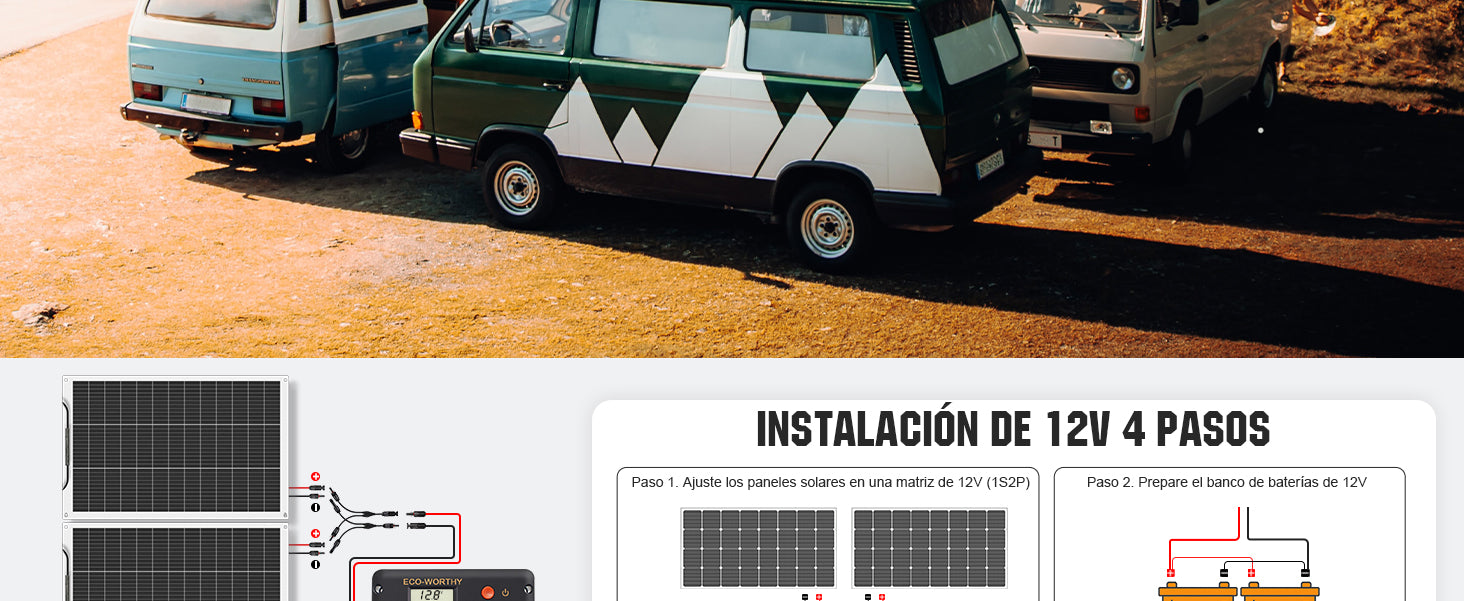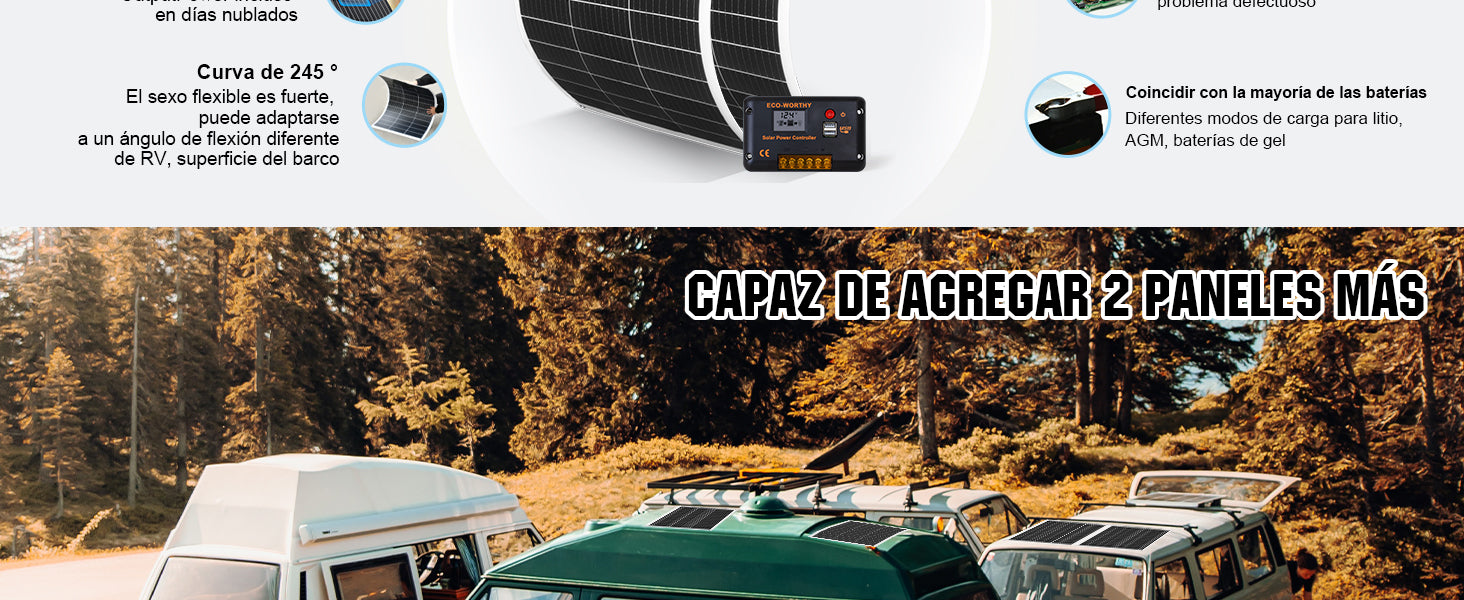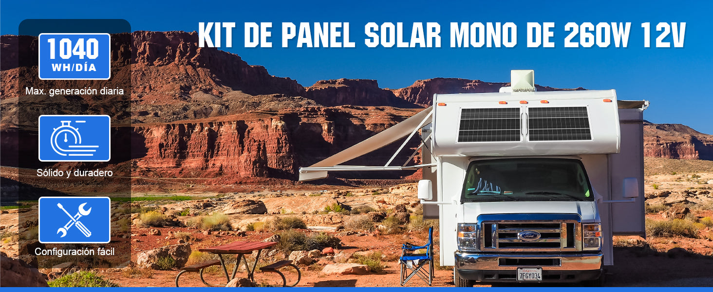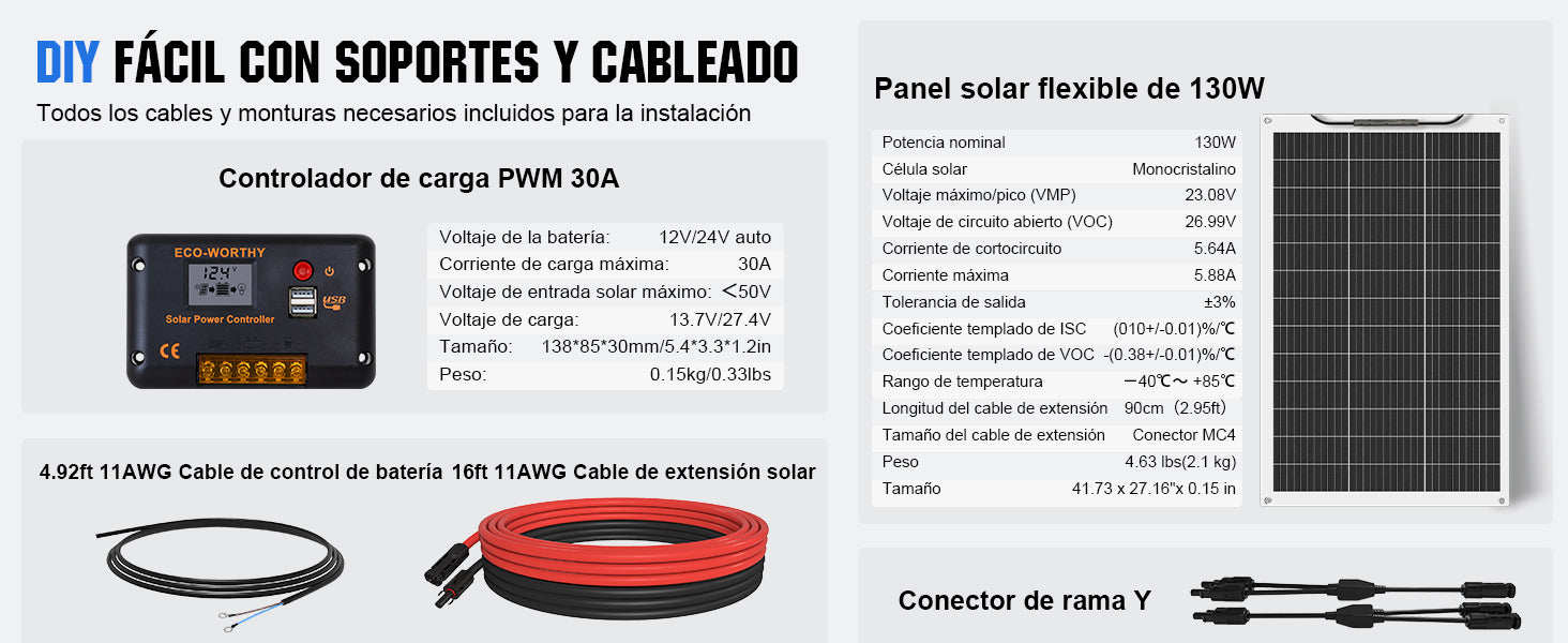 Este kit completo incluye Panel solar flexible 130W 12V alto rendimiento, Regulador solar 30A/60A y todos los elementos fotovoltaicos necesarios.