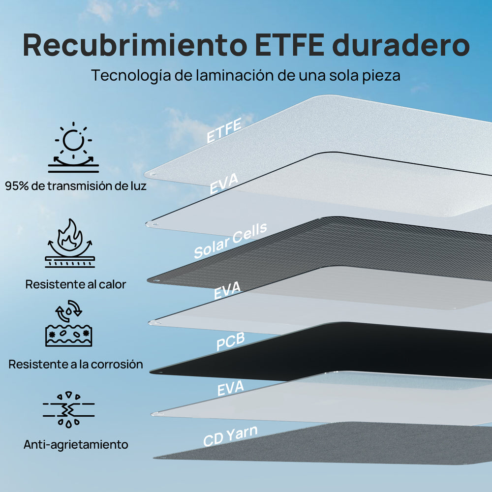Robusto y duradero: Su estructura reforzada de 7 capas con encapsulación laminada garantiza una larga vida útil. El revestimiento de ETFE ofrece resistencia al agua y al polvo, además de una mayor durabilidad en condiciones exteriores exigentes.