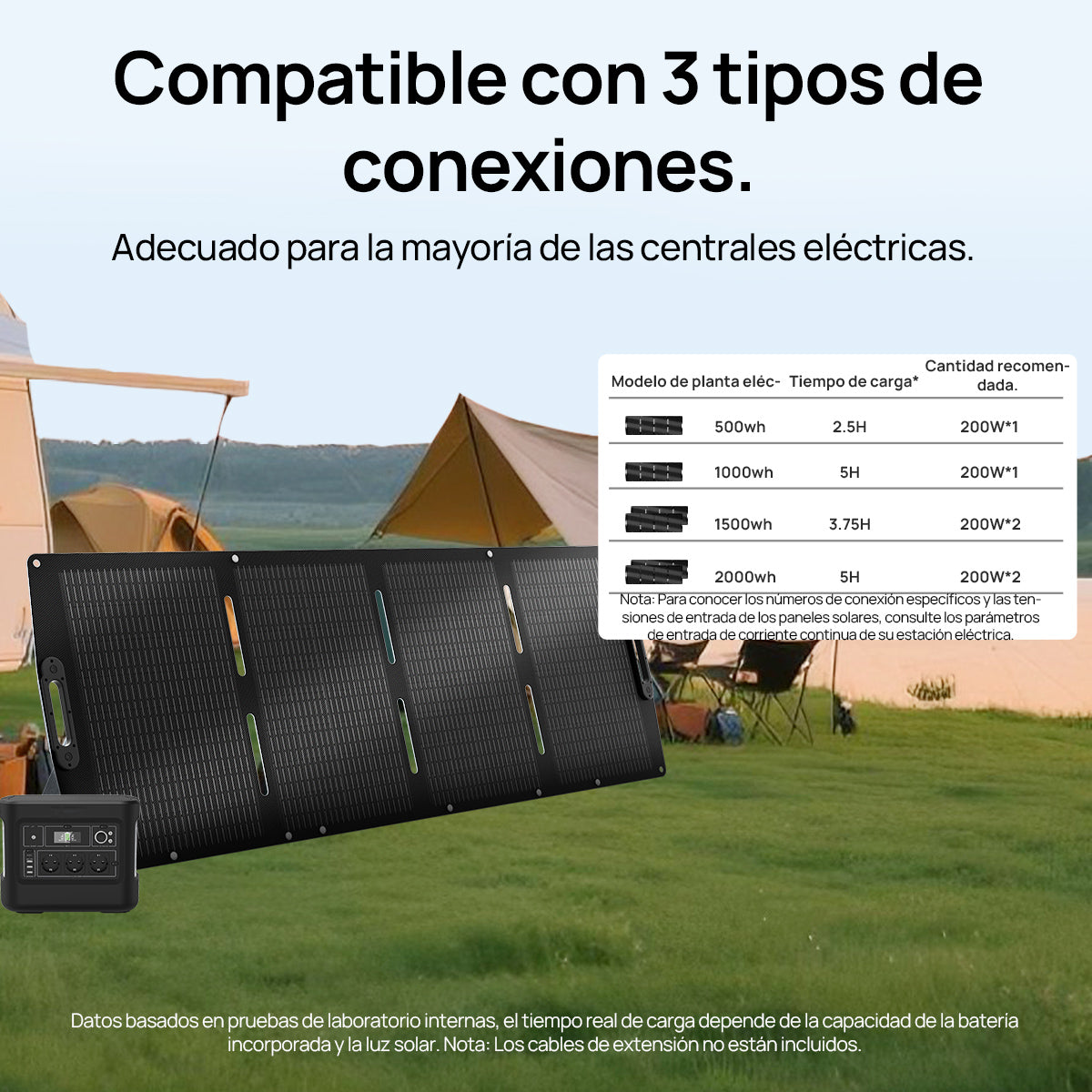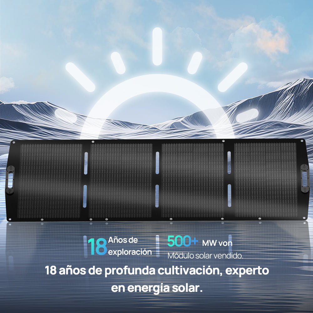 Sistema de energía ampliable: El panel solar portátil de 200 W admite conexiones en serie y en paralelo para combinar varios paneles, adaptando la potencia de salida a necesidades energéticas más elevadas.