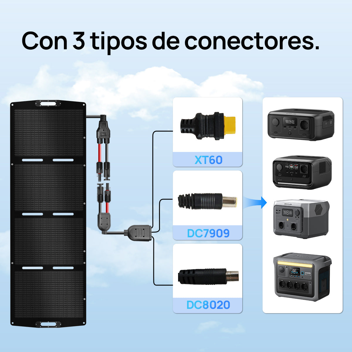 Amplia compatibilidad con dispositivos: Equipado con un cable integrado de 150 cm (XT60/DC7909/DC8020), nuestro panel solar plegable se conecta fácilmente a la mayoría de estaciones de energía y dispositivos, ideal para camping, viajes en autocaravana y carga en exteriores.