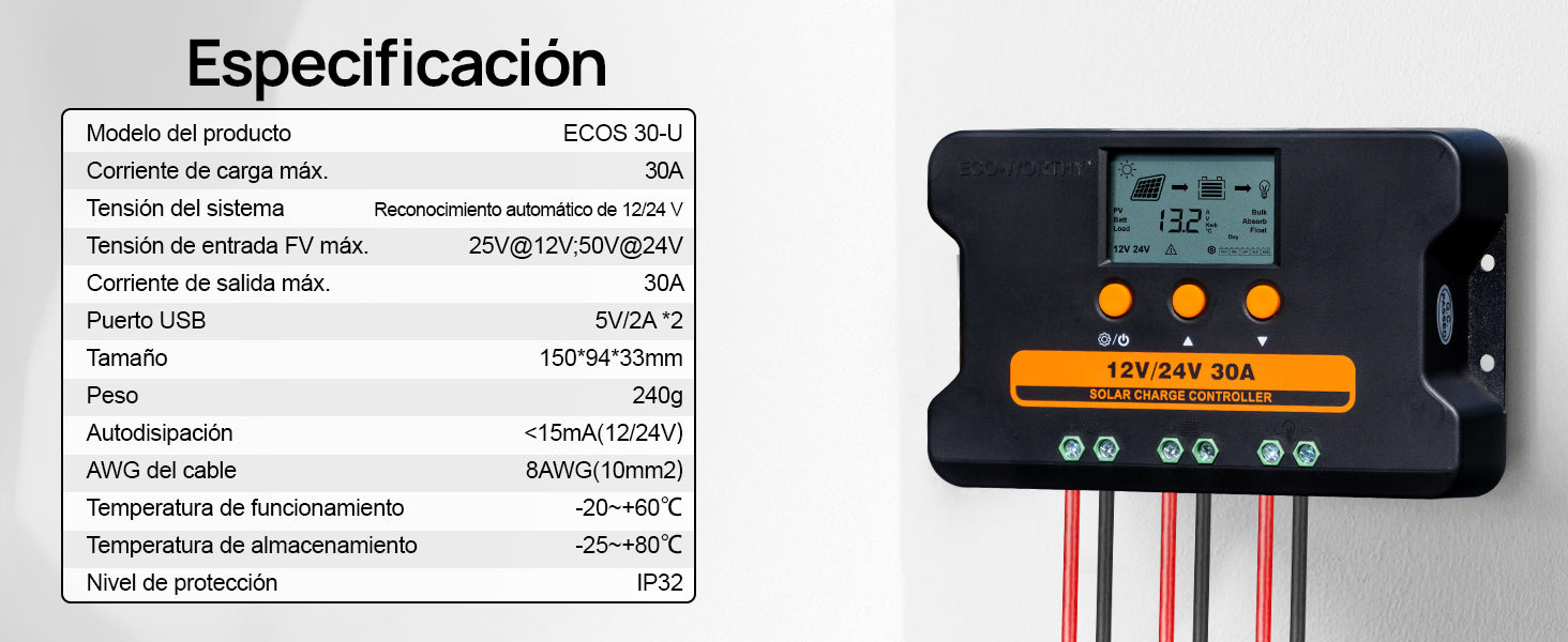 Corriente de carga máxima: 30A | Corriente de descarga: 30A |