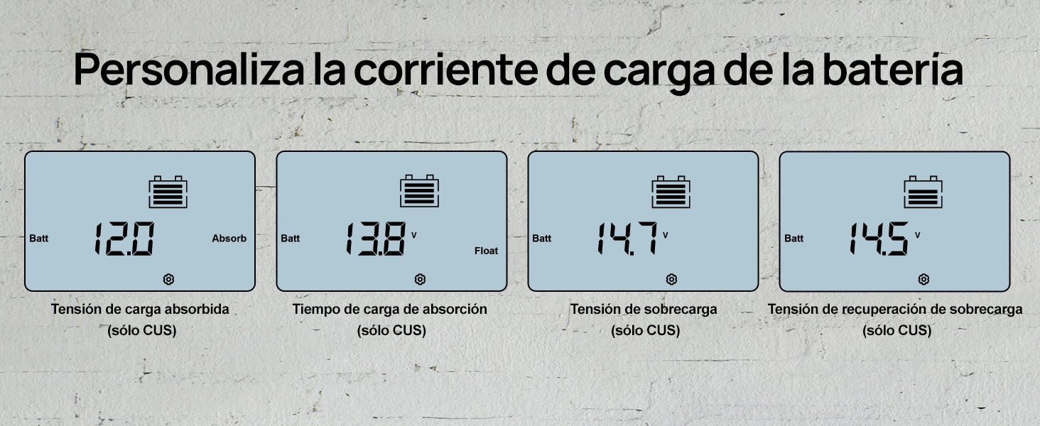 ·Compatible con todas las baterías: Compatible con todas las baterías de 12V y 24V, admite parámetros de batería personalizados (modo CUS) y permite una fácil selección de tipos de baterías preestablecidos: LFP, FLD, SLD, GEL.