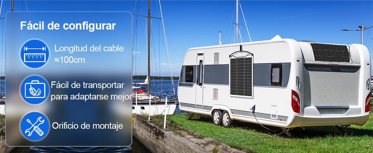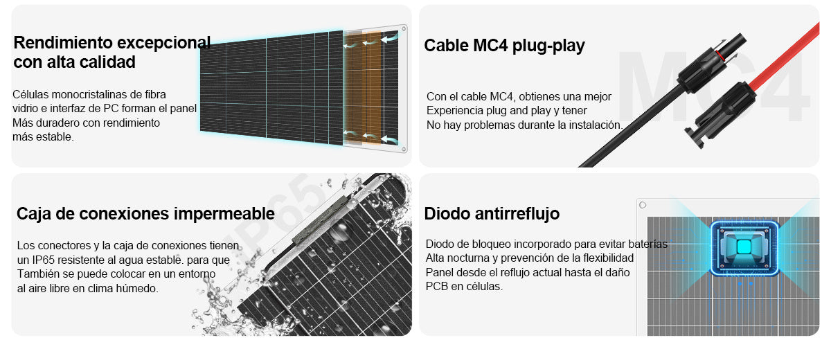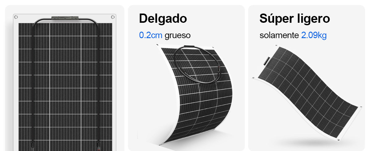 ·Máxima estabilidad: Nuestros módulos solares flexibles están hechos de un compuesto especial de aluminio y plástico. El núcleo de aluminio de la placa base tiene un grosor de 0.8 mm y está revestido de plástico para dar mayor estabilidad a todo el módulo sin reducir la flexibilidad. Gracias a los diodos de derivación integrados en la caja de conexiones, el módulo puede continuar produciendo electricidad incluso cuando está a la sombra o en condiciones de poca luz.